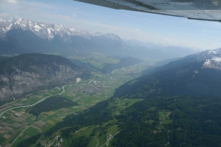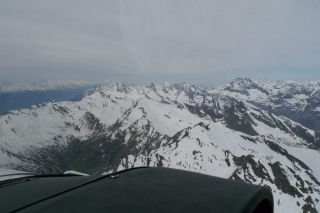 Die diesige Sicht klart etwas auf. Über Füssen angekommen geht es nun durch die Alpentäler Richtung Süden. Über Reutte fliegen wir ins Inntal und von dort weiter ins Ötztal. Mittlerweile haben wir unsere Reiseflughöhe von 10.000ft erreicht. Der Ausblick ist wunderschön, ich kann mich kaum satt sehen. Schneebedeckte Gipfel, grüne Täler, türkisfarbene Bergeseen, verschlafene Schutzhütten und idyllische Bergdörfer säumen unsere Flugroute. Den Autopiloten programmiert bleibt sogar Zeit für ein paar schöne Fotos.