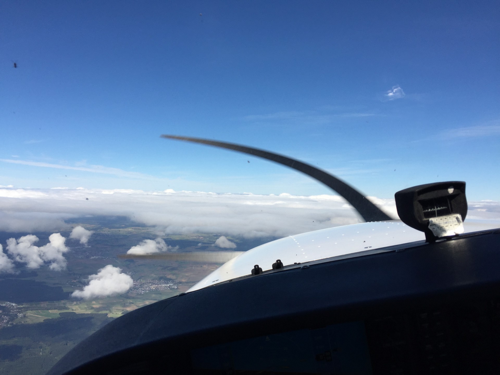 Doch schon über Villingen-Schwenningen ist eine größere Wolkenlücke zu erkennen. Die Sonne strahlt freundlich hindurch und lädt mich zu einem spontanen Steigflug in das satte Blau des Himmels ein.