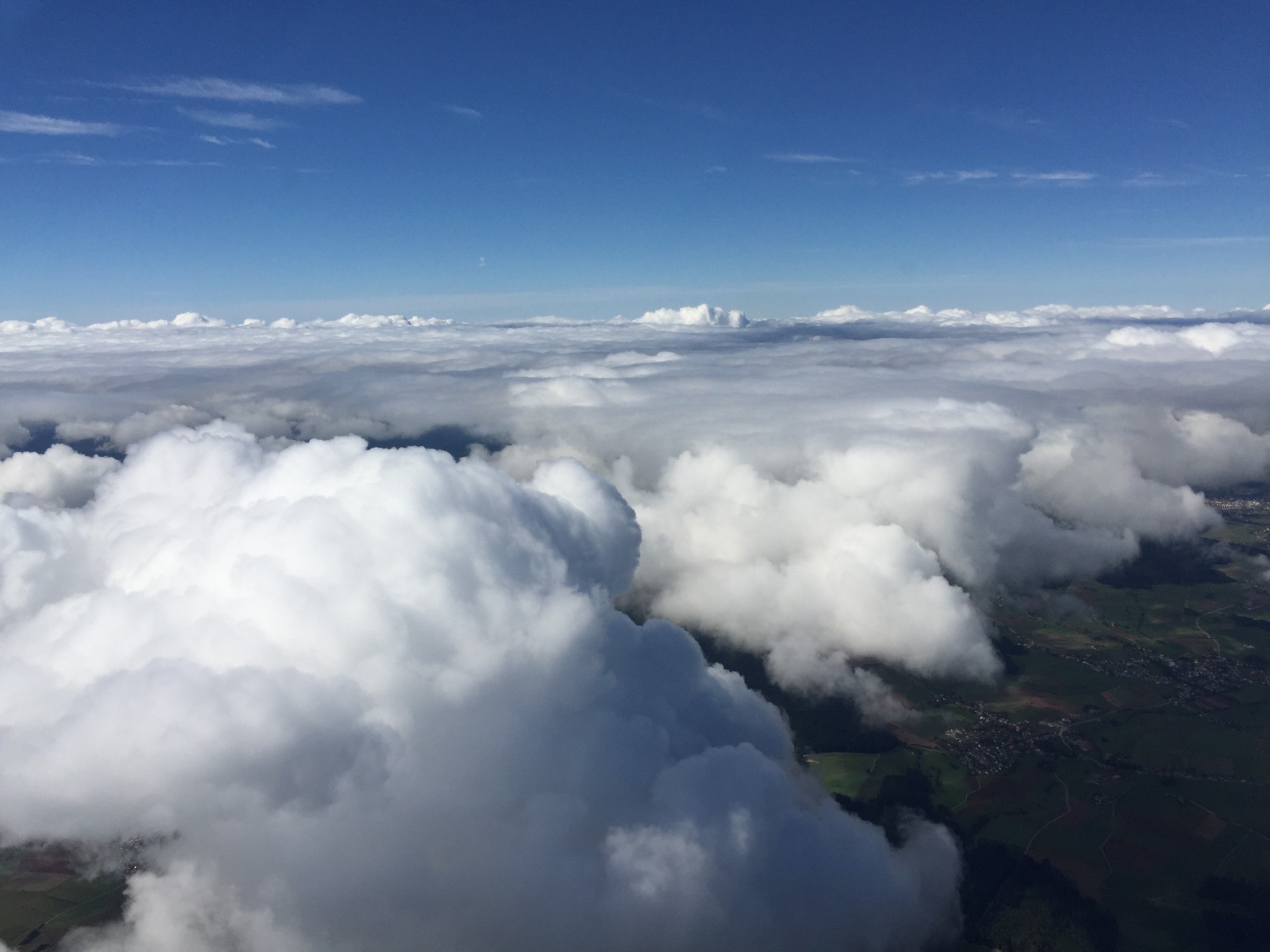Langsam schraube ich mich durch die Wolkenlücke immer weiter nach oben. Auf Flugfläche 95, knapp unterhalb des Luftraums CHARLIE bekomme ich schließlich das zu sehen, was ich für heute eigentlich schon abgeschrieben hatte. Einen spektakulären Ausblick auf den stahlblauen Sonnenhimmel über einer geschlossene Wolkendecke. Eine ganze Weile lasse ich mich so treiben und sauge diesen Anblick förmlich auf.