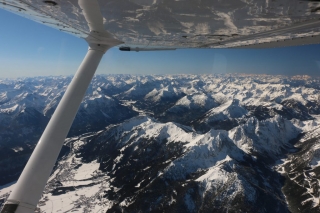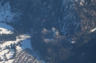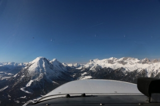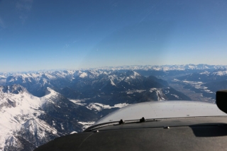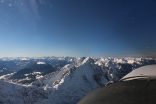 Bei Füssen steige ich auf FL115 und München übergibt mich an Innsbruck Approach. Ab jetzt wird es spannend. So weit wie heute bin ich noch nie alleine in die Alpen eingeflogen. Ich erhalte ein Routing zur Zugspitze und genieße die sagenhafte Aussicht auf die verschneiten Berggipfel der Voralpen und des Hauptalpenkamms. Unter mir erspähe ich das Schloss Neuschwanstein.