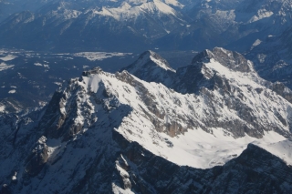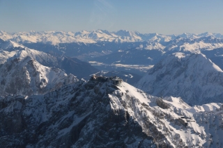 Heute sind alle Parameter im Normalbereich und ich kann den weiteren Flug genießen. Es geht an der Zugspitze vorbei durch das Gaistal. Rechter Hand ist bereits das Inntal zu bestaunen, noch abgetrennt vom Gaistal durch scharfkantige beinahe 3.000 Meter hohe Berge. Überall sind Skilifte und winzige Punkte zu erkennen, die den Berg hinunter gleiten. Ob die Skifahrer den kleinen weissen Punkt am Himmel wohl bemerken?
