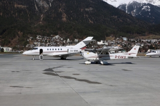 Ich stelle den Motor ab, steige aus und stehe mitten drin im Trubel. Die Sonne scheint warm und ich beschließe meine Jacke im Flieger zu lassen. Nur eine Warnweste nehme ich vorsichtshalber mit. Nachdem ich meine Landegebühren bezahlt habe, genieße ich das Privileg, mich frei auf dem Vorfeld zu bewegen und schieße beim Spaziergang zurück zum Flieger ein paar Bilder. Ein Airliner jagt den nächsten. Ein Privatjet erscheint opulenter als der andere. Eine Dame in Pelz, die offensichtlich vom Skifahren kommt, steigt in einen Helikopter und wird von Ihrem Piloten zurück nach Frankreich kutschiert. Die ansonsten herrliche Alpen-Luft riecht nach Kersion. Und mein mitgebrachtes Brötchen schmeckt zudem mit dieser Kulisse heute besonders gut.